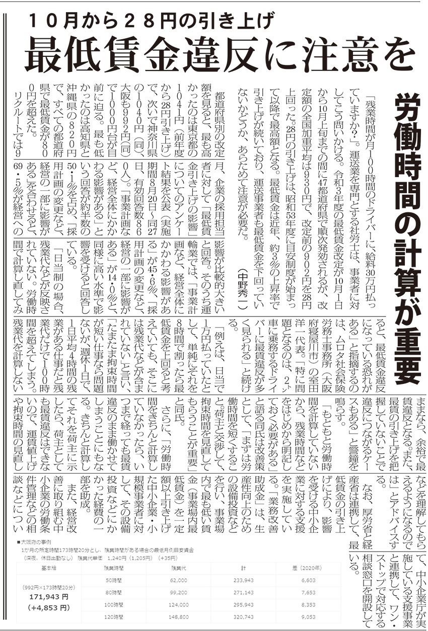 1か月の平均所定時間173時間20分とし、残業時間がある場合の最低月例目安賃金